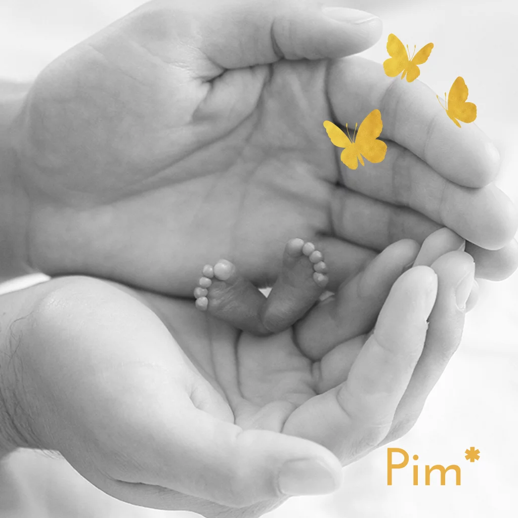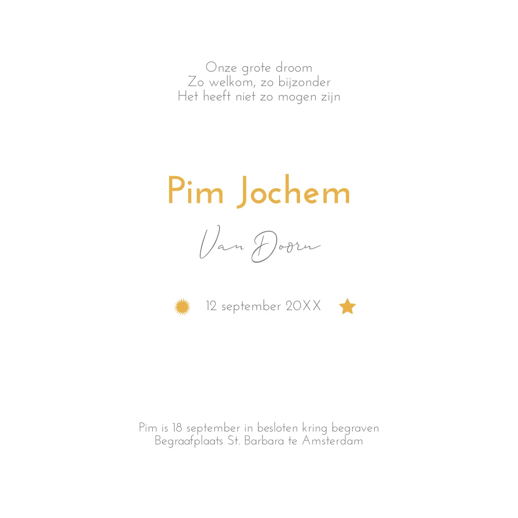Stijlvolle rouwkaart voor vlinderkindje, de kleuren van de vlinders en teksten kun je zelf aanpassen. Gebruik deze foto of plaats zelf een mooie foto van jullie te vroeg geboren kleintje.