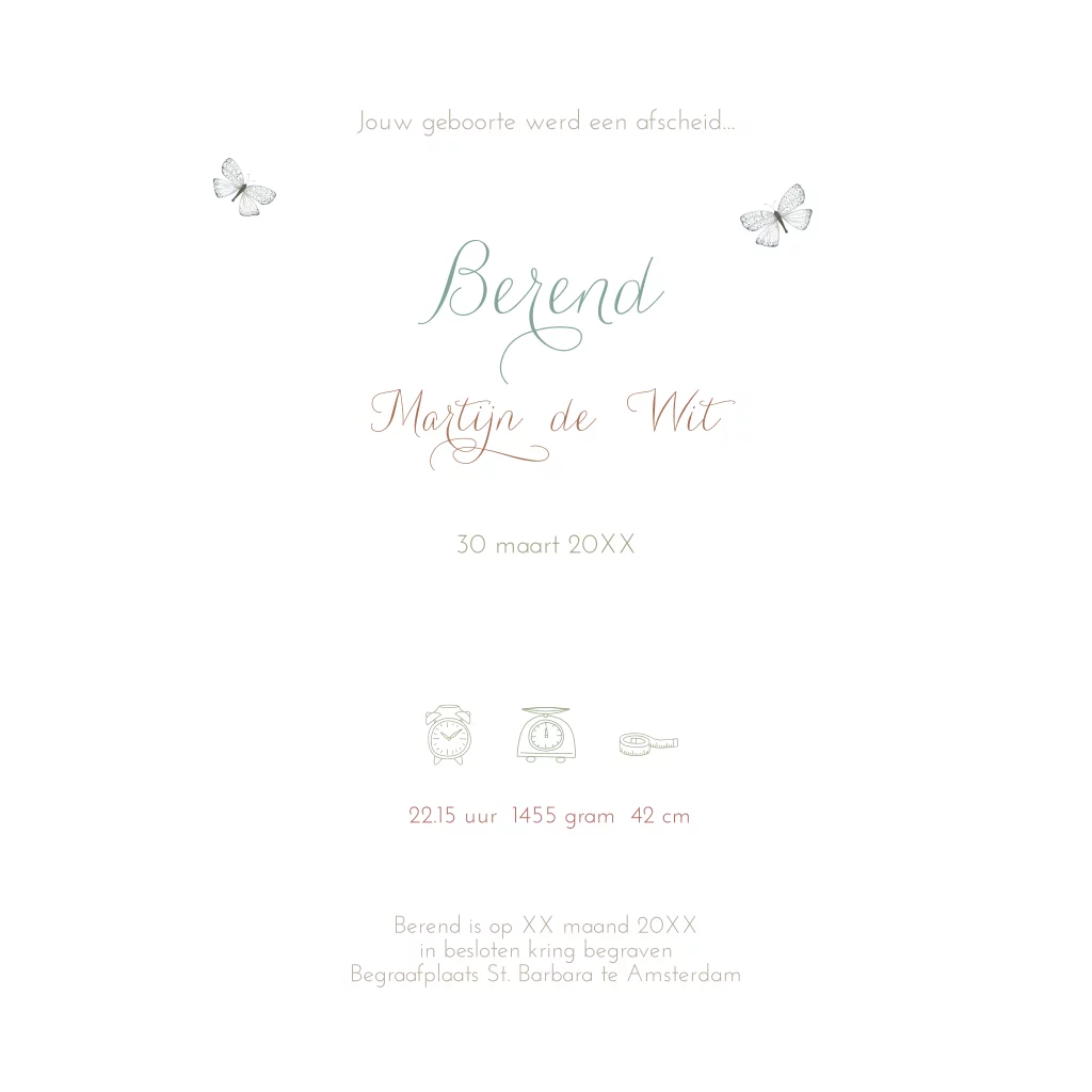 Waterverf rouwkaartje voor een vlinderkindje met waterverf en illustratie met veldbloemen. Aan de binnenzijde is er ruimte voor een foto indien gewenst