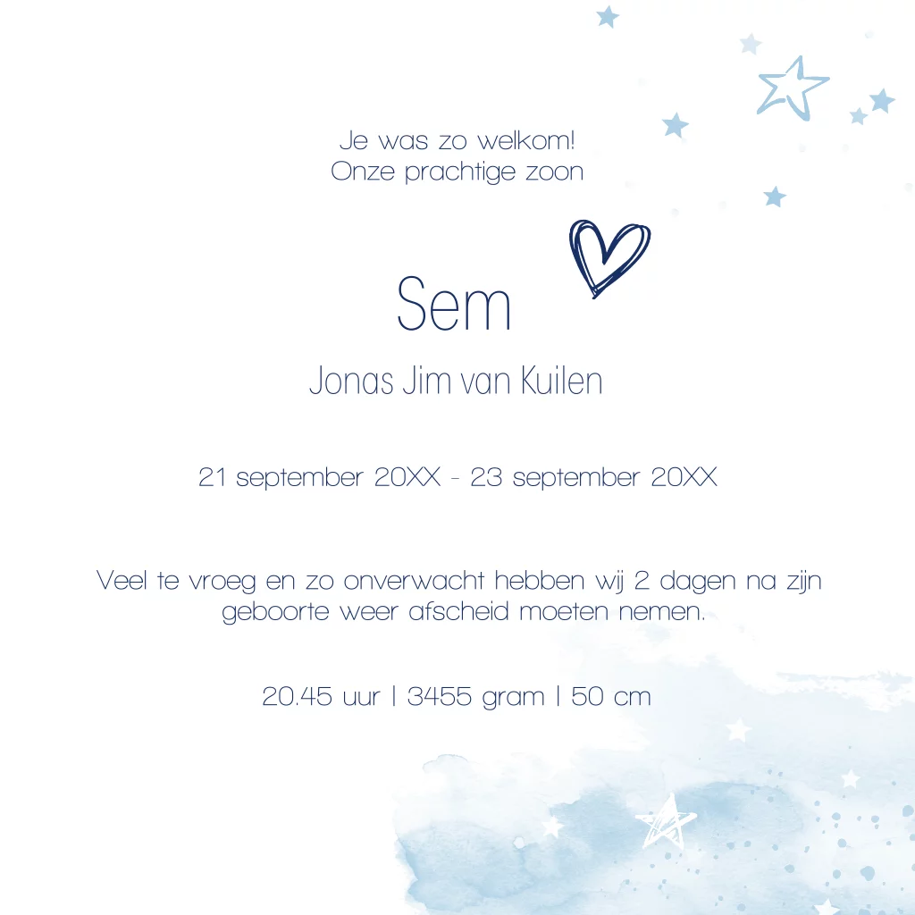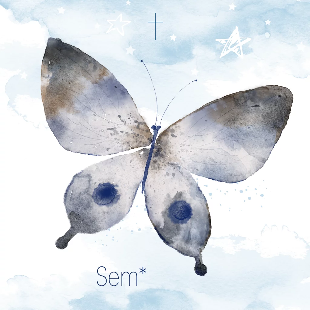 Waterverf rouwkaartje met confetti van sterretjes op witte achtergrond met mooie vlinder van aquarel. Rouwkaartje voor een vlinderkindje | sterrenkindje