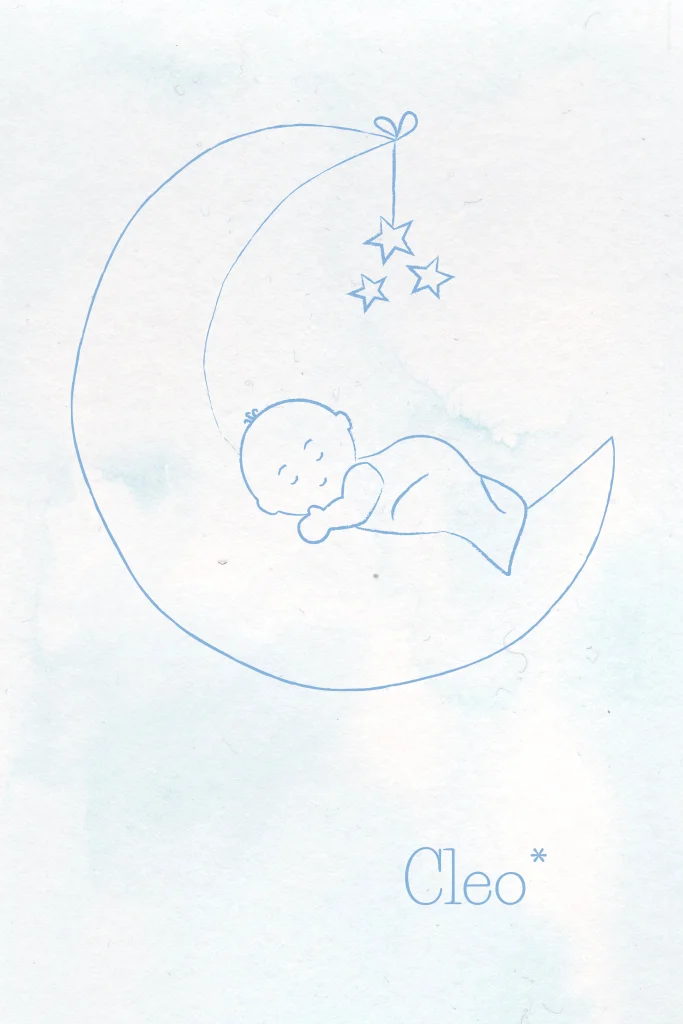lief staand rouwkaartje met slapend kindje op de maan en waterverf