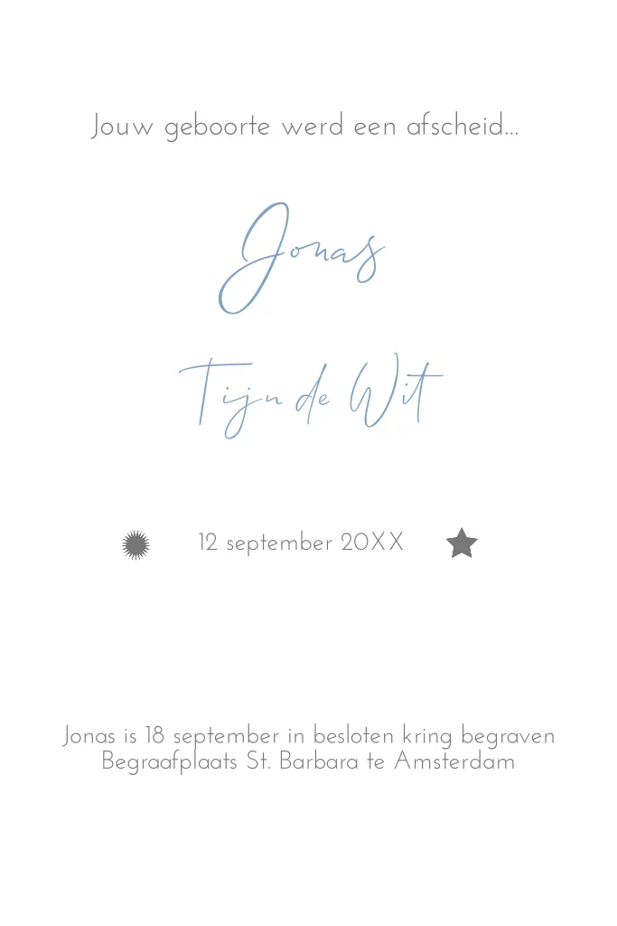 Mooie kinder-rouwkaart met sterren. Stijlvolle rouwkaart voor vlinderkindje, de kleuren van de sterren en teksten kun je zelf aanpassen. Staand dubbel