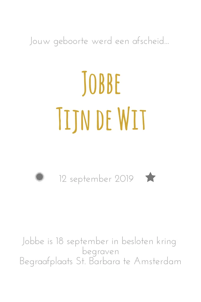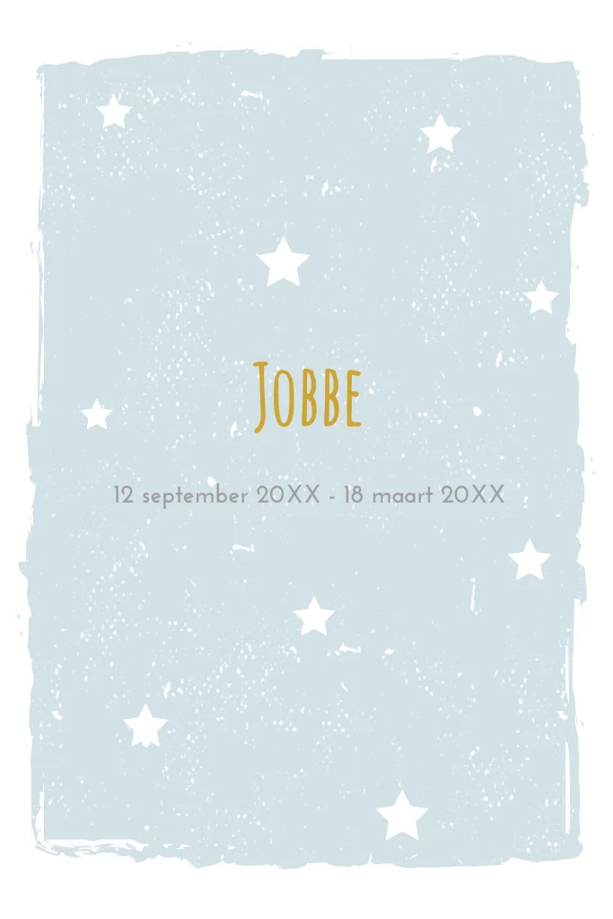 Stijlvolle rouwkaart voor vlinderkindje, de kleuren van de sterren en teksten kun je zelf aanpassen. Staand dubbel