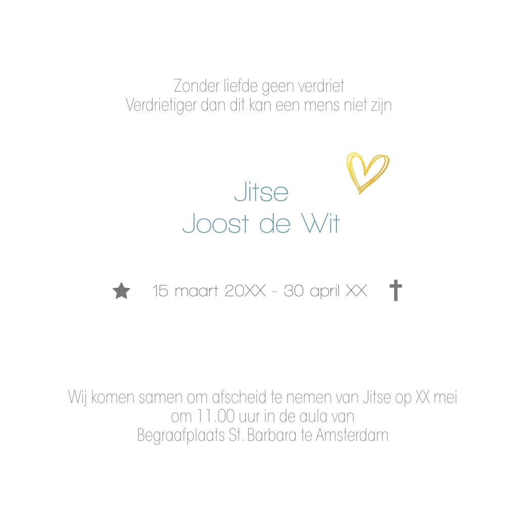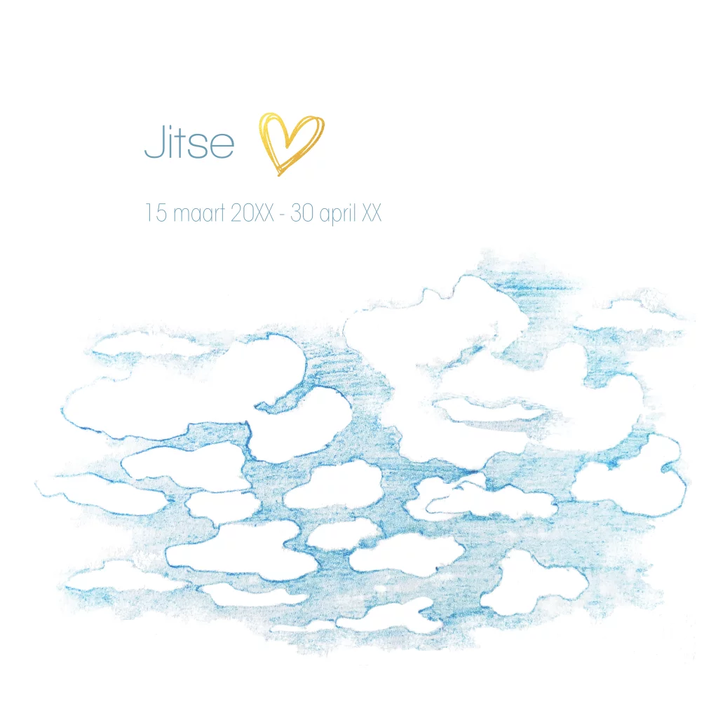 Mooie foto kinder-rouwkaart met blauwe getekende wolkjes en goudkleurig hartje.