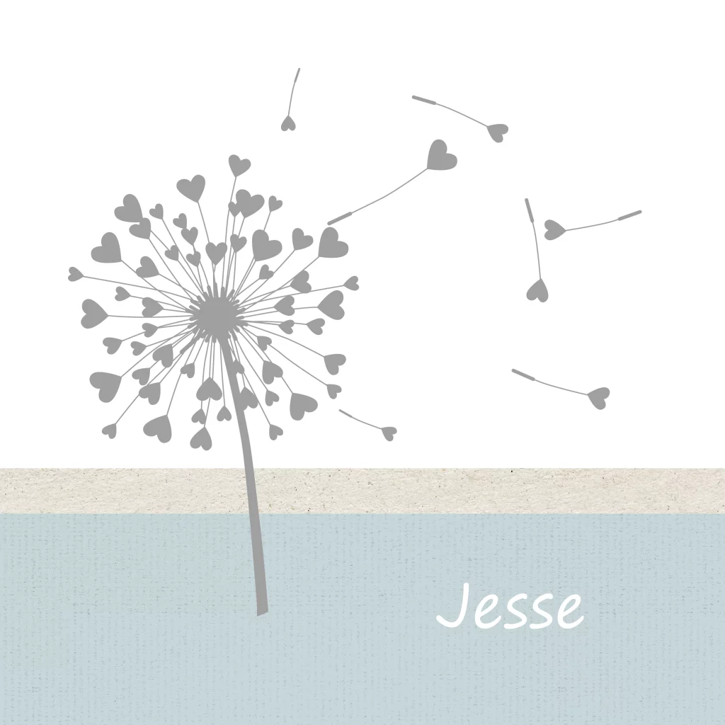 Mooie kinder-rouwkaart met rand van twee soorten kraft papier en een paardenbloem met pluisjes in de vorm van hartjes.