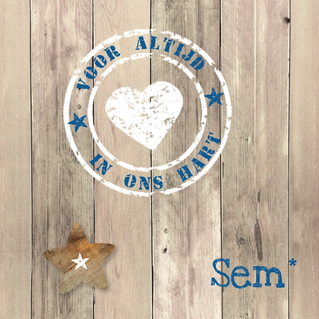 Mooie rouwkaart met steigerhout achtergrond, houten sterren en stoere stempels. Voor altijd in ons hart. Modern rouwkaartje geschikt voor alle leeftijden.