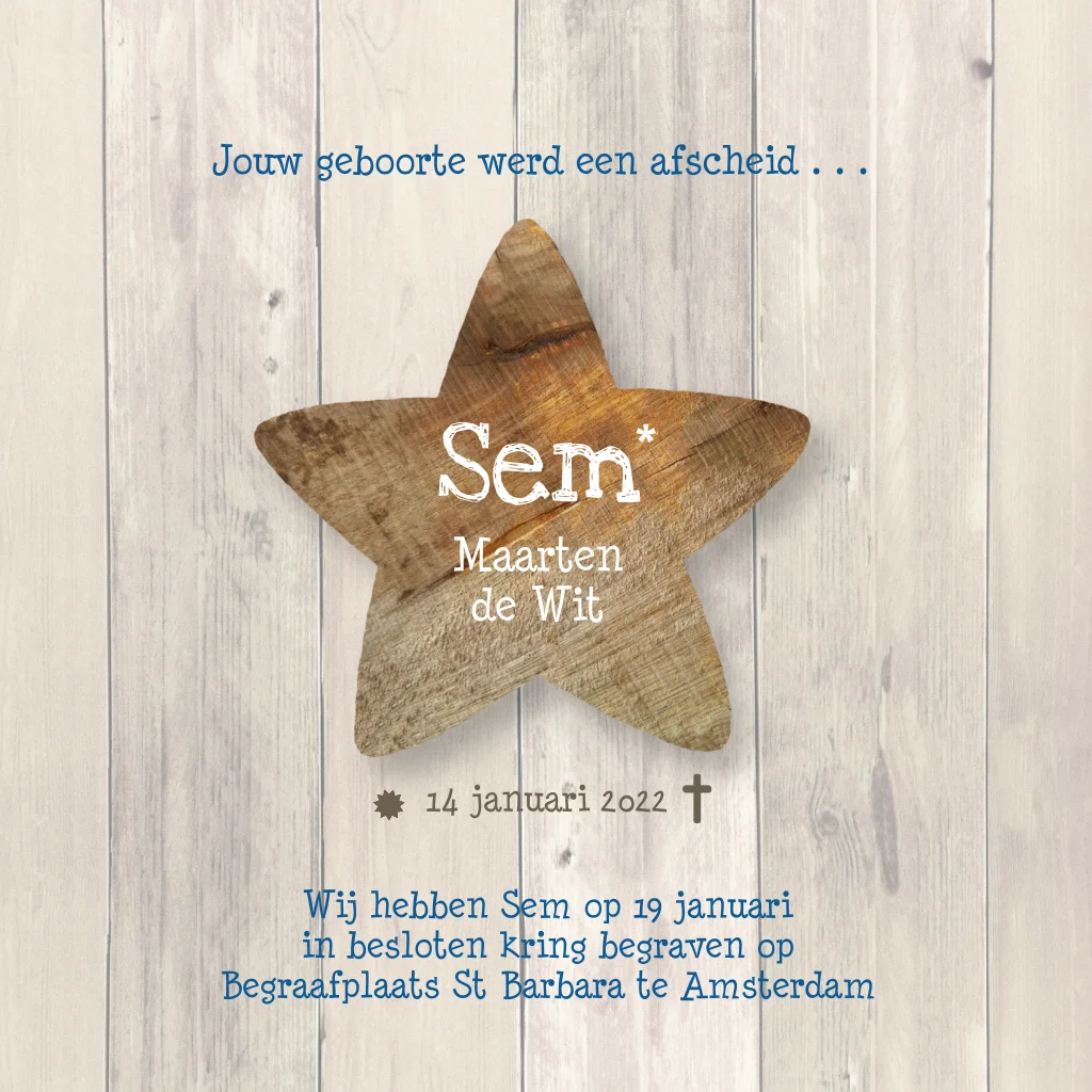 stoer rouwkaartje met houten ster en stempels op sloophout