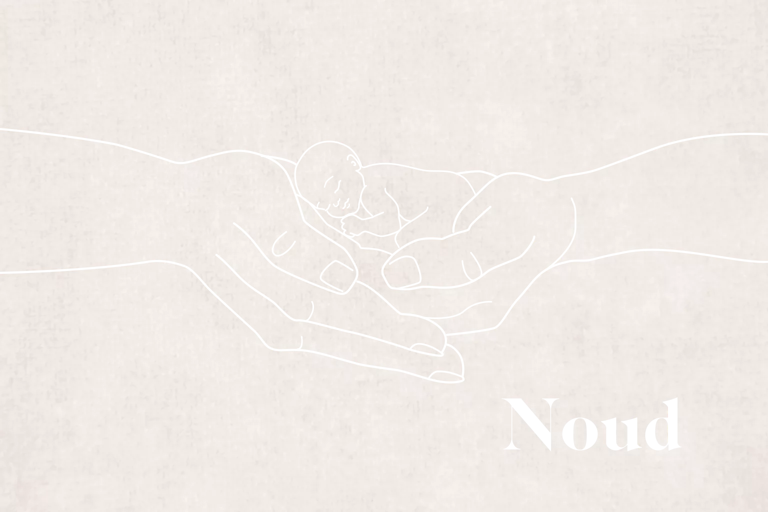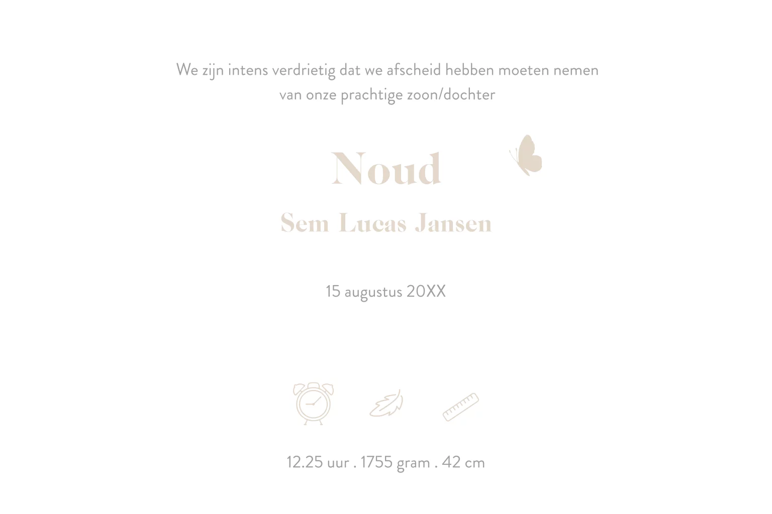 Lieve baby-rouwkaart met de naam en een illustratie van een kleine baby, foetus in twee handen gedrukt in goudfolie. Pas eenvoudig zelf de kleuren en teksten aan van dit rouwkaartje of zet om naar zilverfolie of roséfolie, zwarte folie of hoogglans.