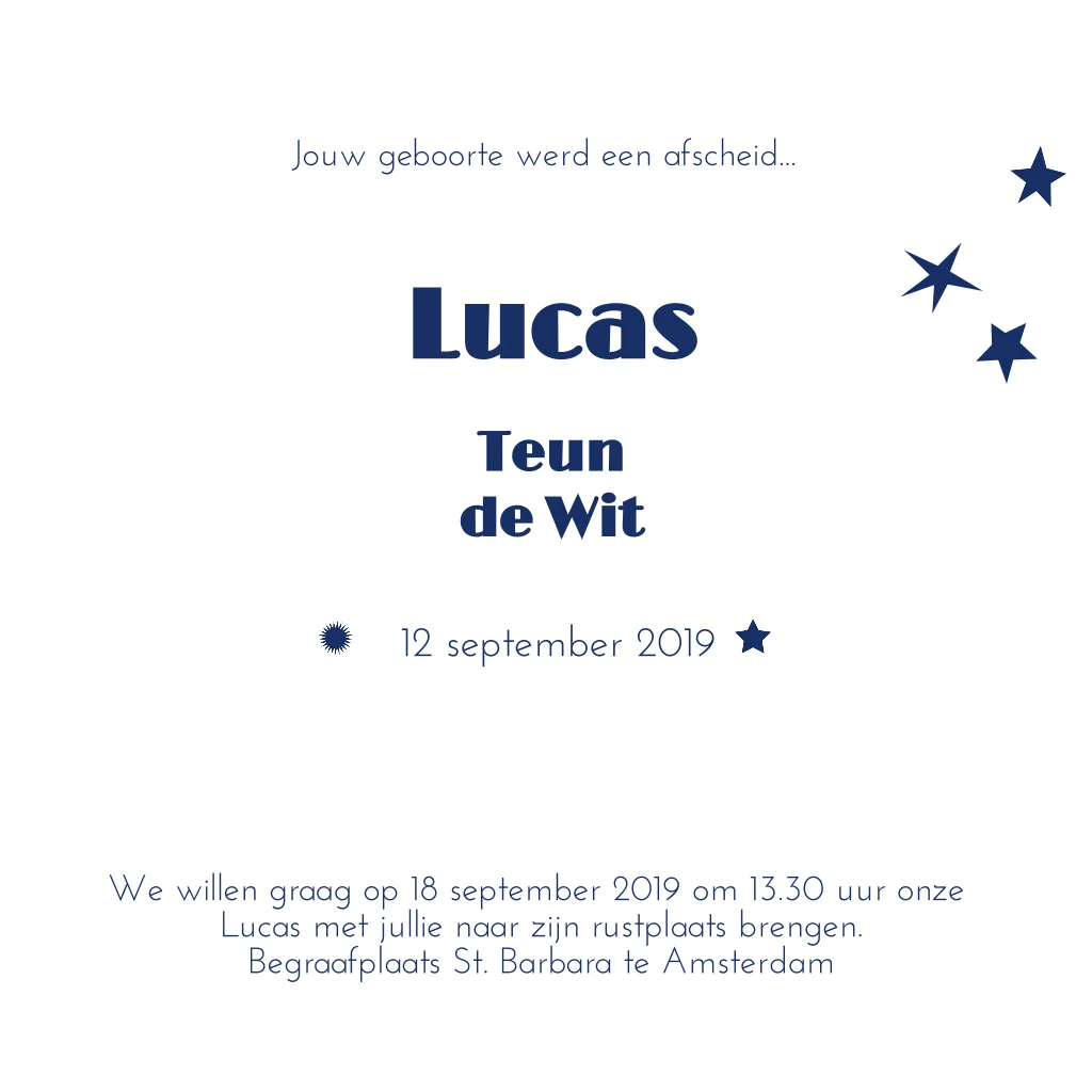 Mooie kinder-rouwkaart voor jongetje met sterren in verschillende soorten.