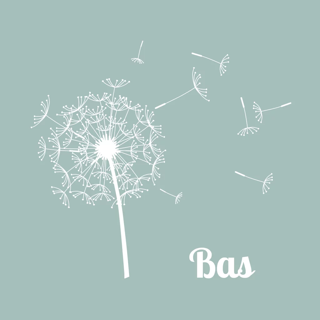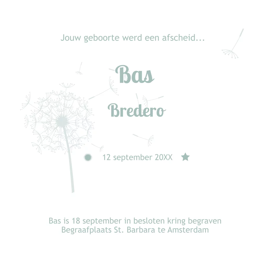 Stijlvolle rouwkaart voor vlinderkindje, de kleuren van de pluizebloem en teksten kun je zelf aanpassen.