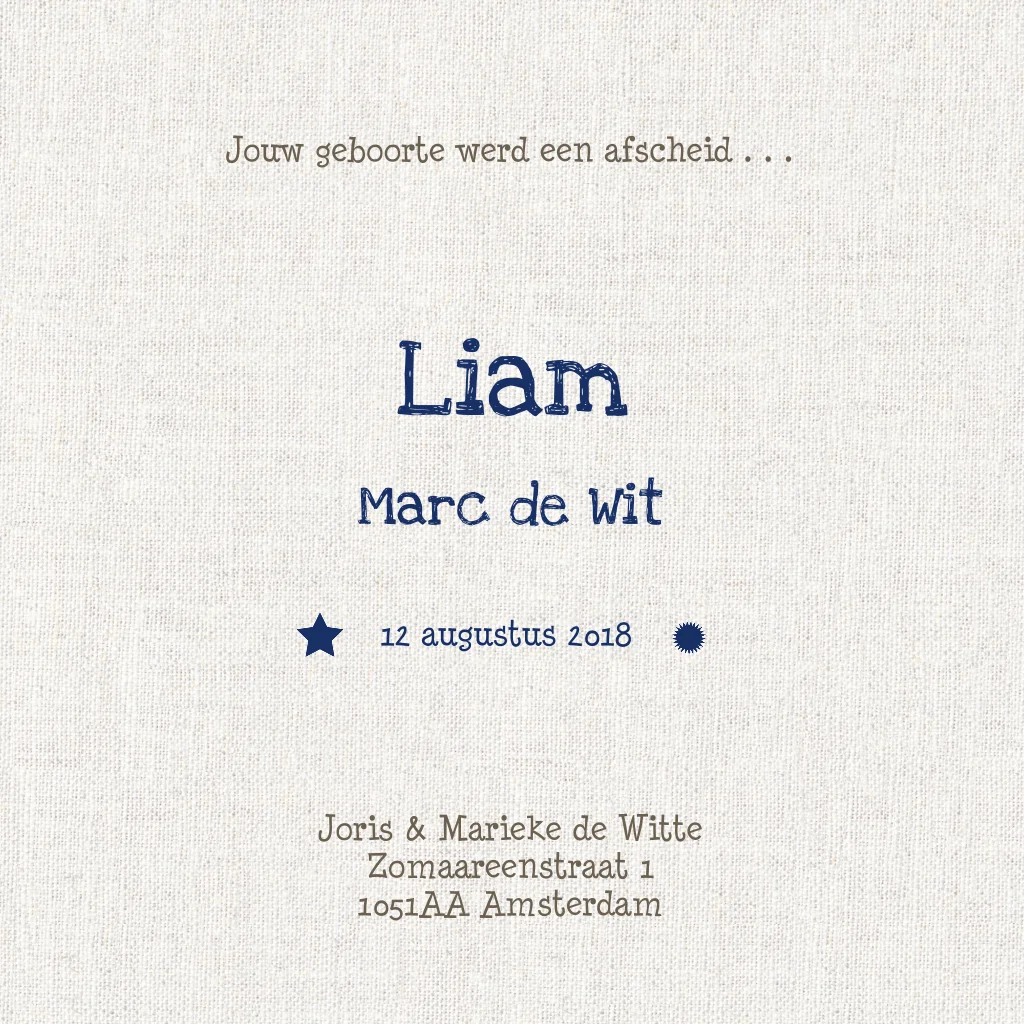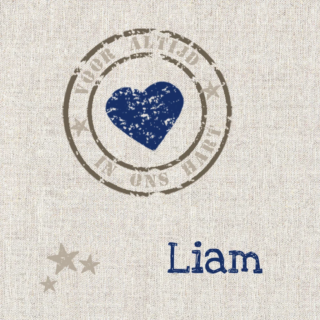Mooie rouwkaart met linnen achtergrond, hartjes, sterren en stoere stempels. Voor altijd in ons hart. Modern rouwkaartje geschikt voor alle leeftijden.