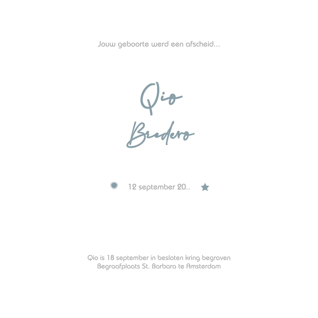 Stijlvolle rouwkaart voor vlinderkindje, de kleuren van de sterren en teksten kun je zelf aanpassen.