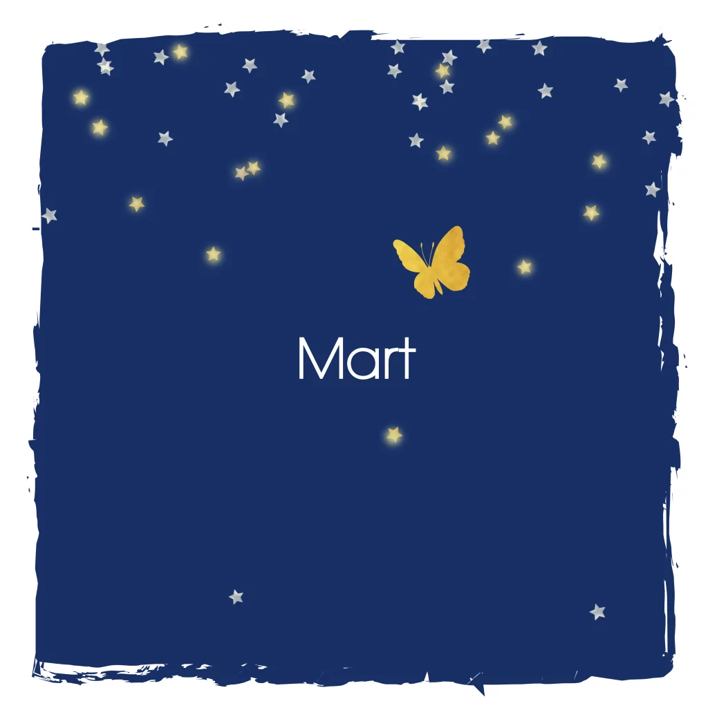 Mooie kinder-rouwkaart voor jongen met gouden vlindertje en sterren op geverfde achtergrond. Stijlvolle rouwkaart voor vlinderkindje.