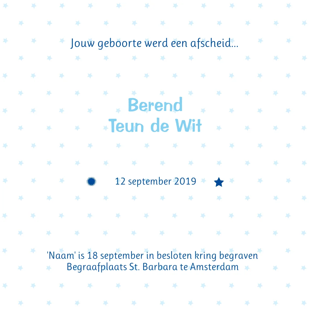 Stijlvolle rouwkaart voor vlinderkindje, de kleuren van de sterren en teksten kun je zelf aanpassen.