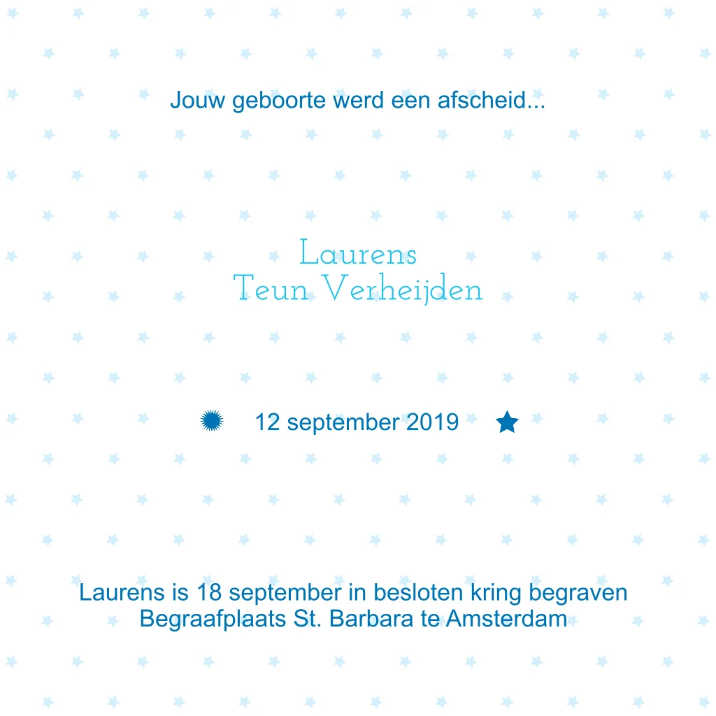 Stijlvolle rouwkaart voor vlinderkindje, de kleuren van de sterren en teksten kun je zelf aanpassen.