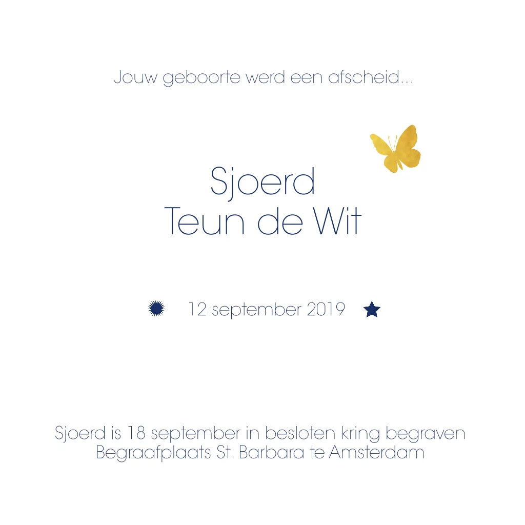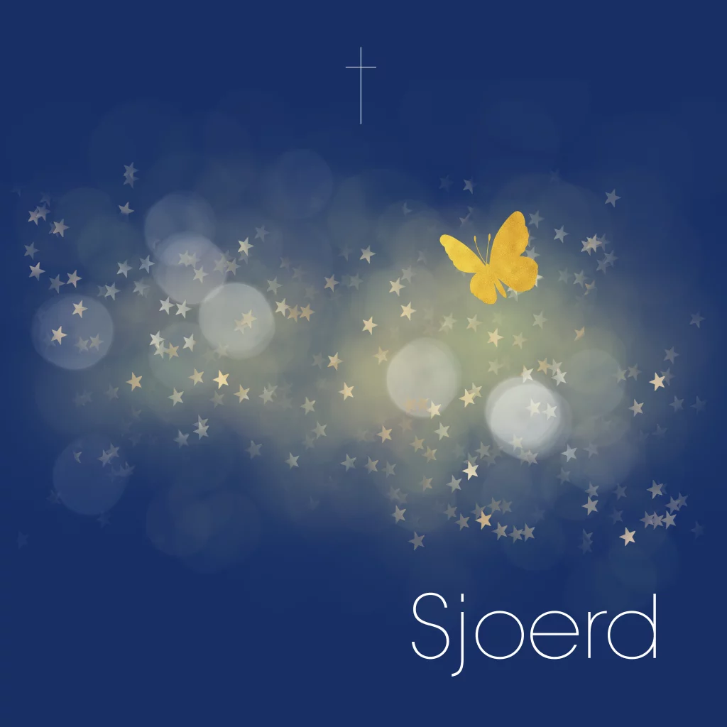 Mooie kinder-rouwkaart met gouden sterretjes en wolkjes en vlindertje. Rouwkaart geschikt voor vlinderkindje.