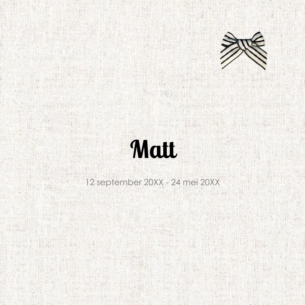 Mooie kinder-rouwkaart voor jongen, met gestreept strikje op linnen achtergrond. Linnen rouwkaartje met gestreepte strik