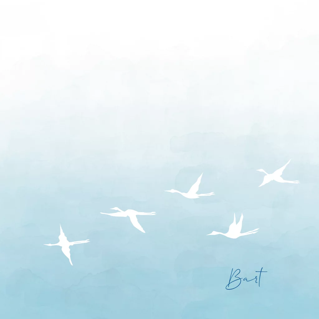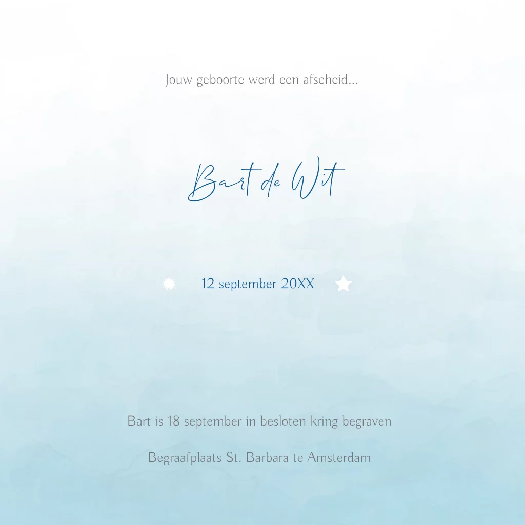 Mooie kinder-rouwkaart voor jongen, met vogeltjes op waterverf achtergrond. Lief babyrouwkaartje in waterverf pastelkleuren voor vlinderkindje, zoontje.