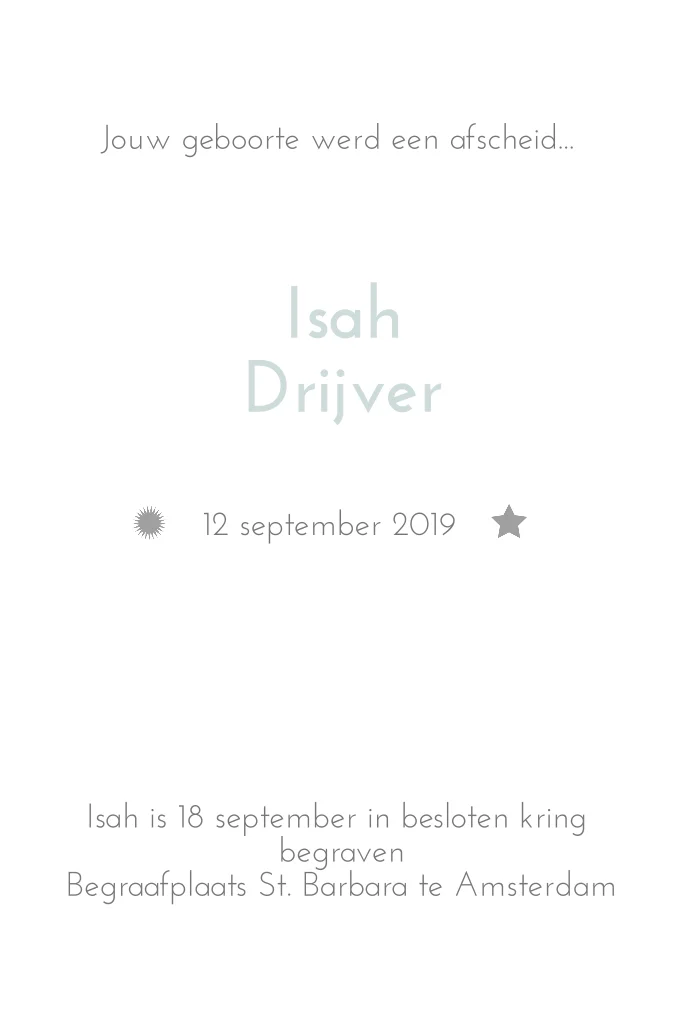 Stijlvolle rouwkaart voor vlinderkindje, de kleuren van de sterren en teksten kun je zelf aanpassen.