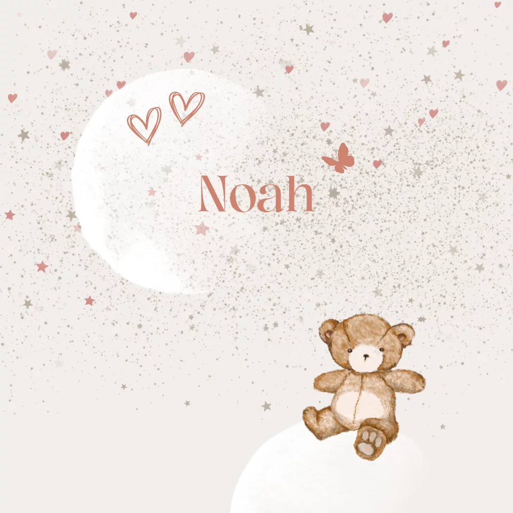 Een lief rouwkaartje voor een afscheid van een zoontje of dochtertje met een geschilderd schattig beertje en sterretjes. De teksten en kleuren zijn eenvoudig aan te passen naar jouw eigen wens, dit is een unisex baby rouwkaartje.
