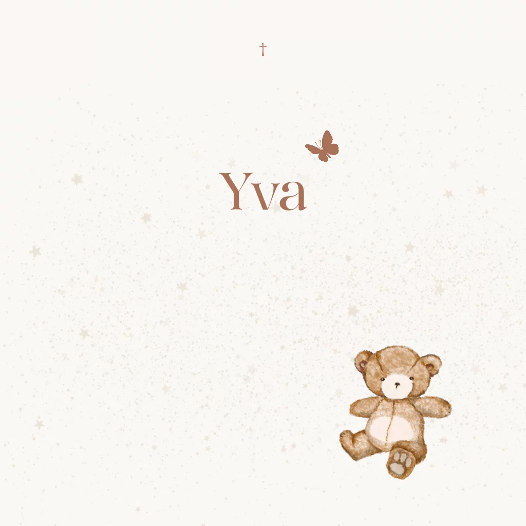 Een lief unisex rouwkaartje voor een afscheid van een zoontje of dochtertje met een geschilderd schattig beertje en sterretjes. De teksten en kleuren zijn eenvoudig aan te passen naar jouw eigen wens, dit is een unisex baby-rouwkaartje. Aan de binnenzijde kun je desgewenst een foto of een voetafdrukje plaatsen.
