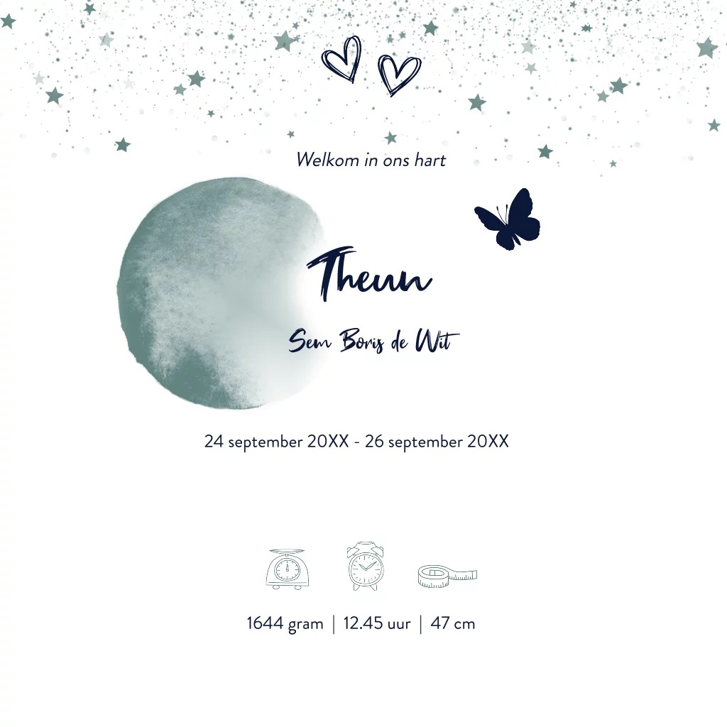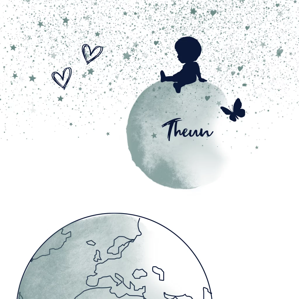 Silhouet rouwkaartje voor jongetje met planeten, sterretjes en een wereldbol. De afbeeldingen en kleuren zijn eenvoudig aan te passen naar jouw eigen idee.