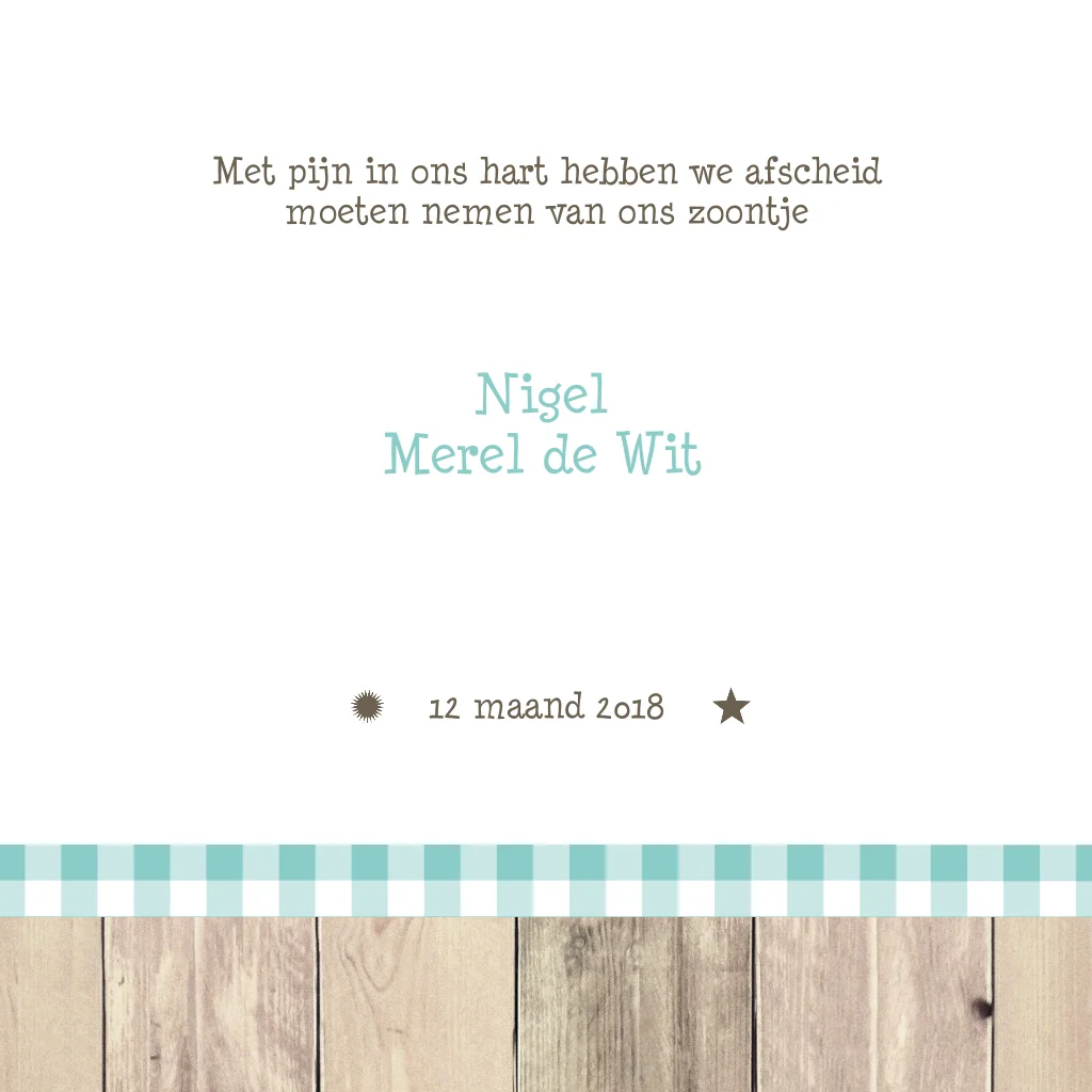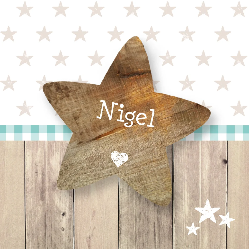 Mooie kinder-rouwkaart met steigerhout en gestempeld sterren-dessin waarop een houten ster met de naam van jullie kindje.