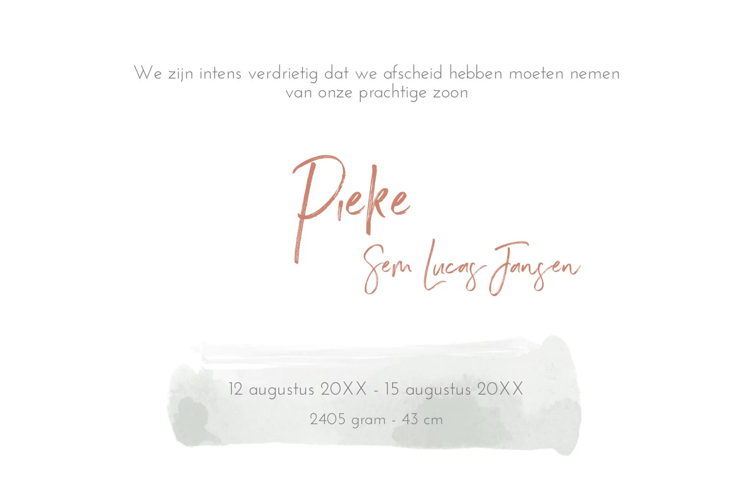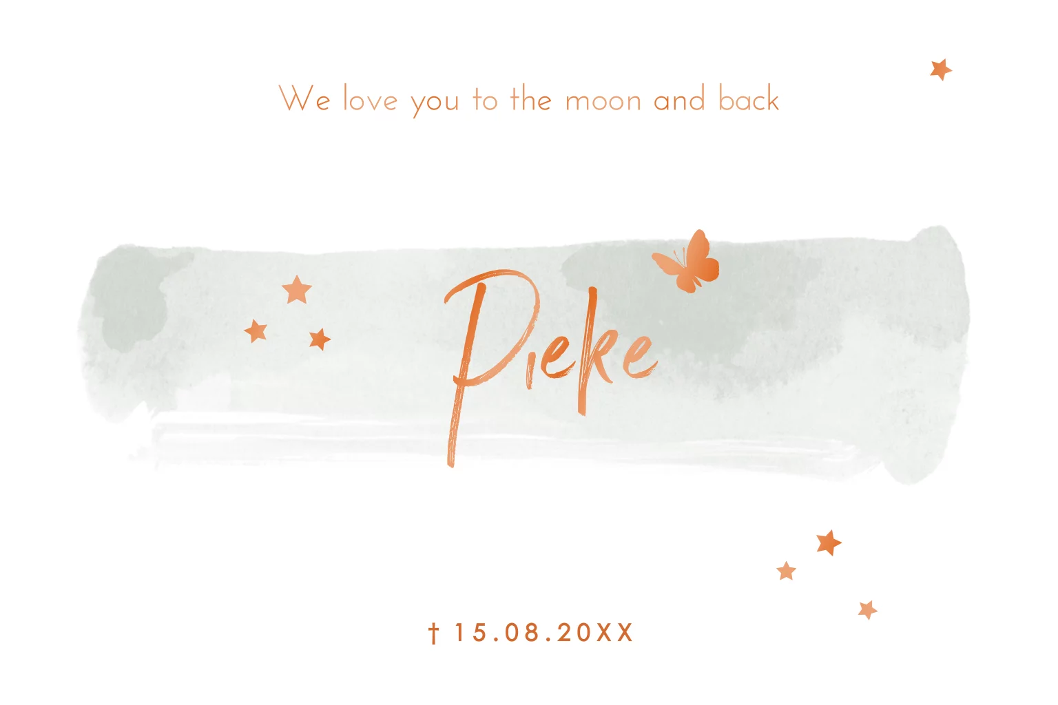 Moderne baby-rouwkaart met hoogglans foliedruk op waterverf streep met de naam en een folie vlindertje en sterretjes op een aquarel veeg op de achtergrond. Pas eenvoudig zelf de kleuren en teksten aan van dit rouwkaartje of zet om naar goudfolie of zilverfolie.