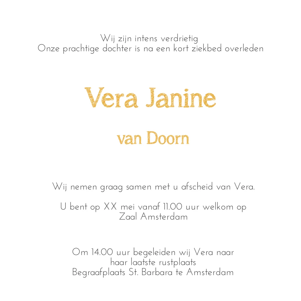 Stijlvolle rouwkaart, de kleuren van de teksten kun je zelf aanpassen. Plaats zelf je foto.