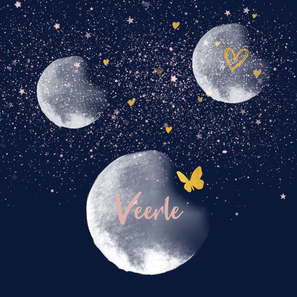 Lieve moderne rouwkaart met confetti van sterretjes, hartjes en vlindertje op een donker blauwe achtergrond als een sterrenhemel mrt planeten.