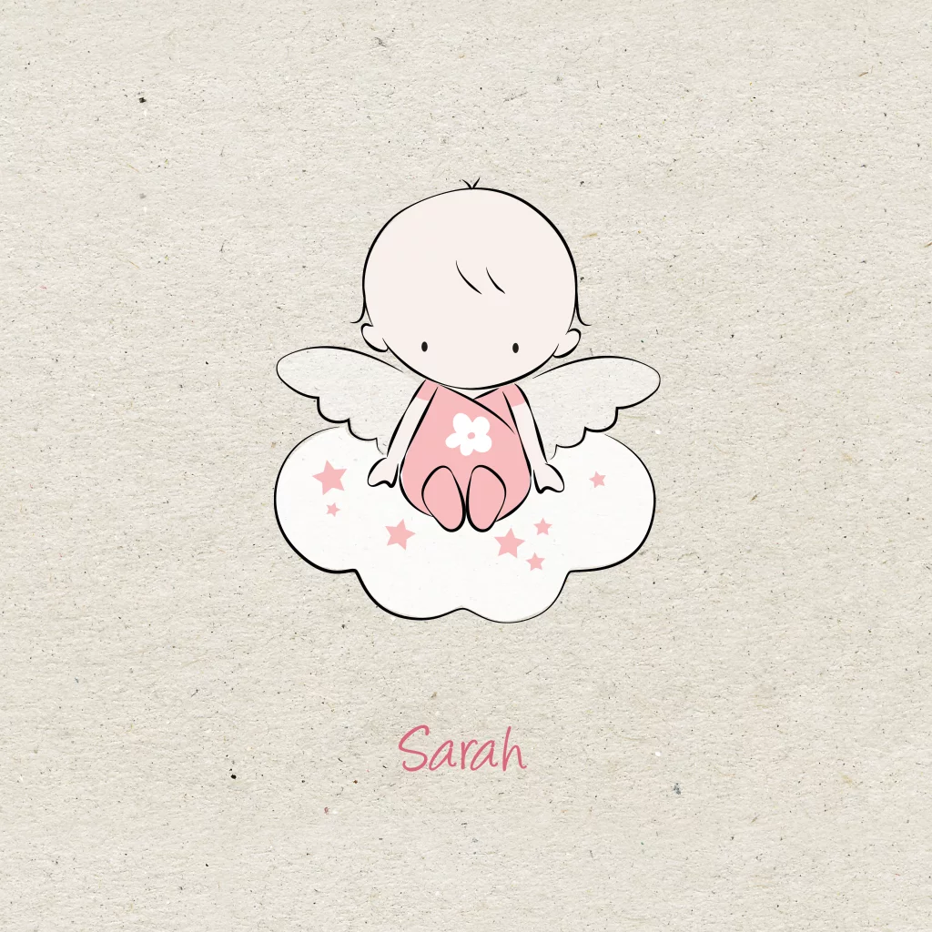 Mooie kinder-rouwkaart met een lief engeltje op een wolkje met sterretjes op karton. Plaats je foto aan de binnenzijde
