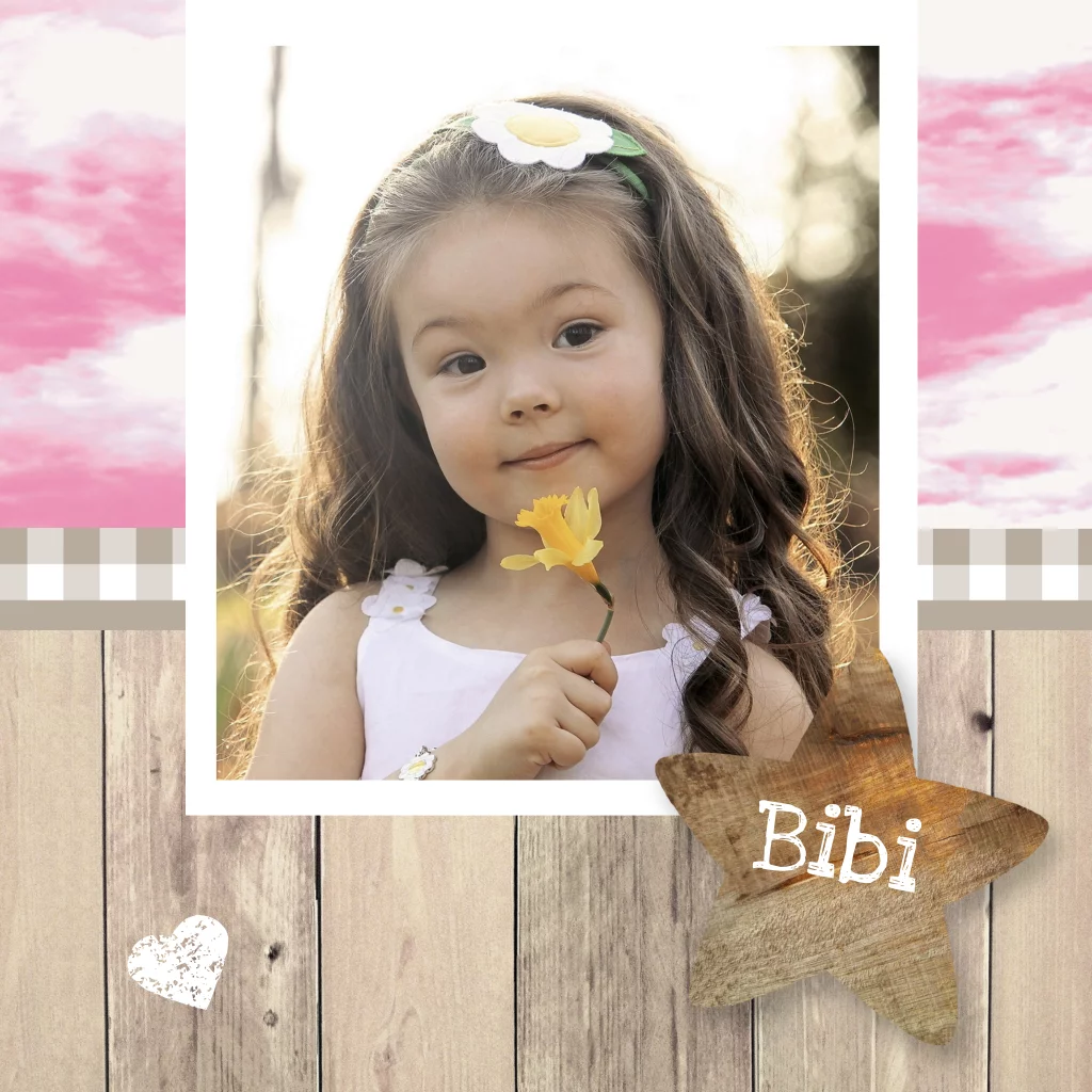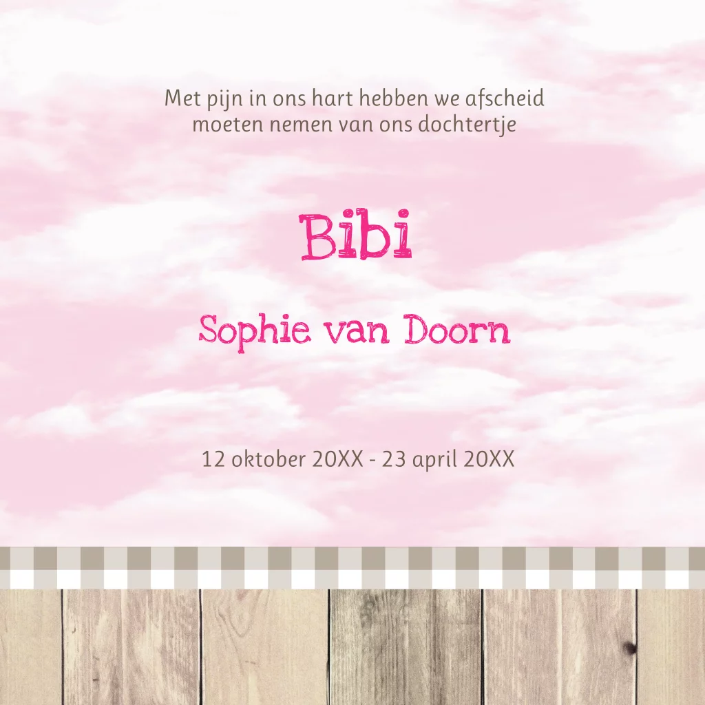 Mooie kinder-rouwkaart met foto, steigerhout, wolkjes en gestempelde sterren waarop een houten ster met de naam van jullie kindje.