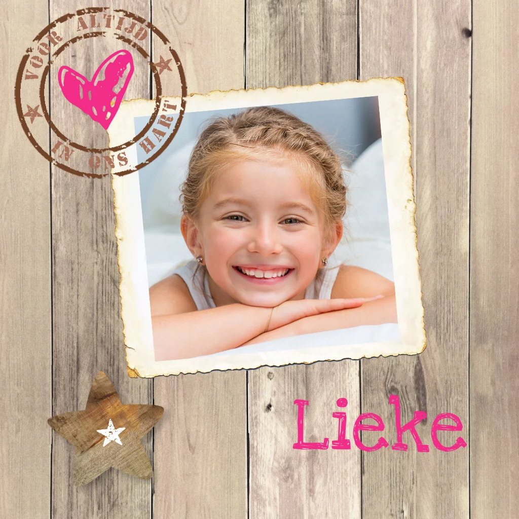 Mooie rouwkaart met steigerhout achtergrond, houten sterren en stoere stempels. Voor altijd in ons hart. Modern rouwkaartje geschikt voor alle leeftijden.