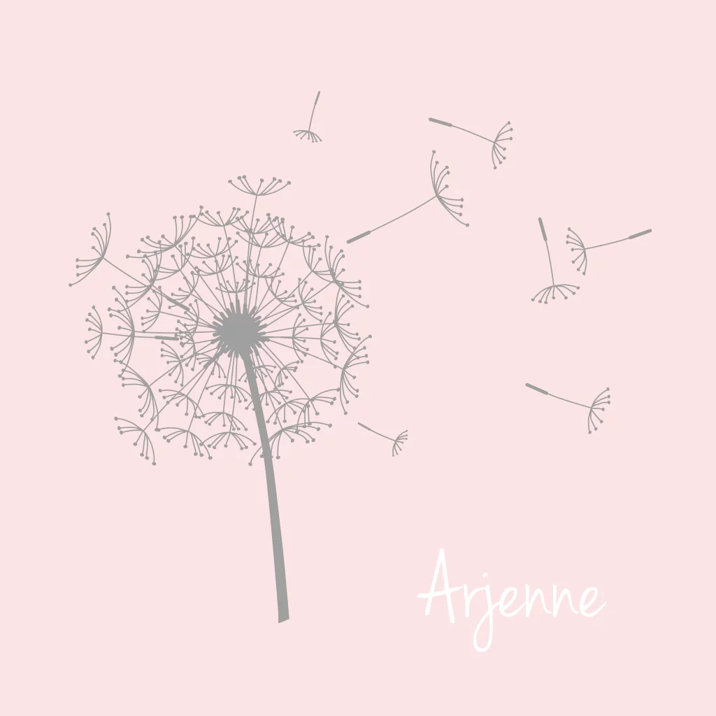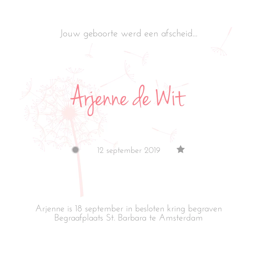 Stijlvolle rouwkaart voor vlinderkindje, de kleuren van de pluizebloem en teksten kun je zelf aanpassen.