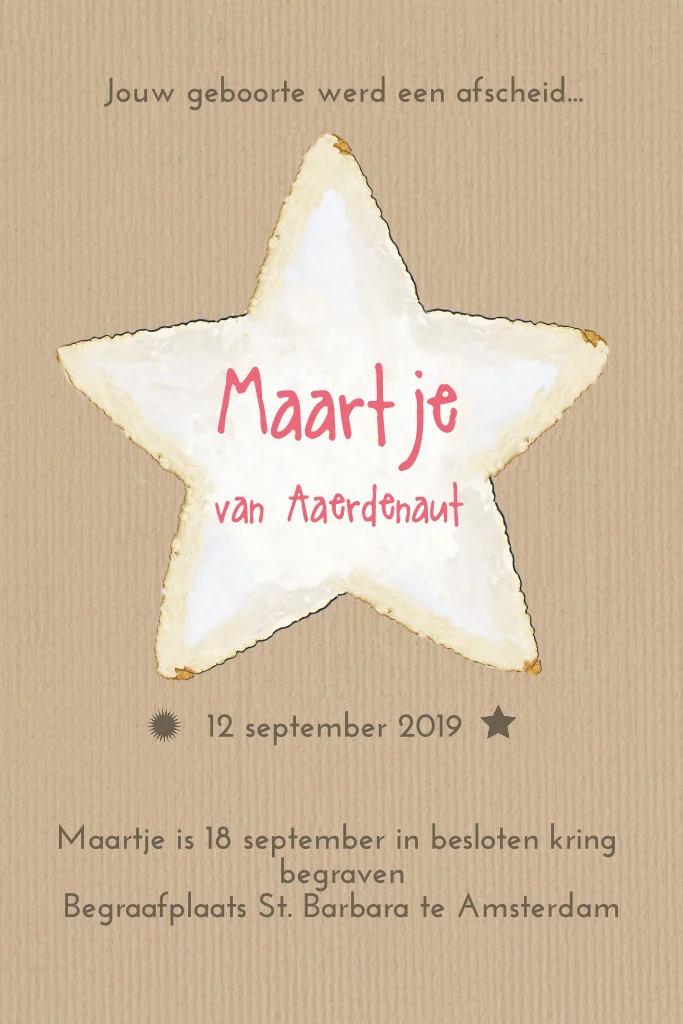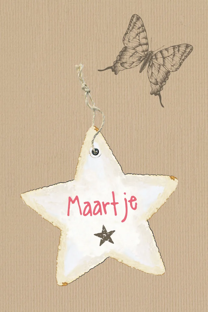 Mooie kinder-rouwkaart voor een meisje met een vintage etiket in de vorm van een ster met touwtje en vlinder op kraftpapier.