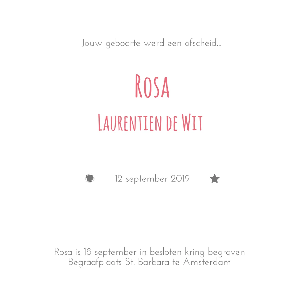 Stijlvolle rouwkaart voor vlinderkindje, de kleuren van de sterren en teksten kun je zelf aanpassen.