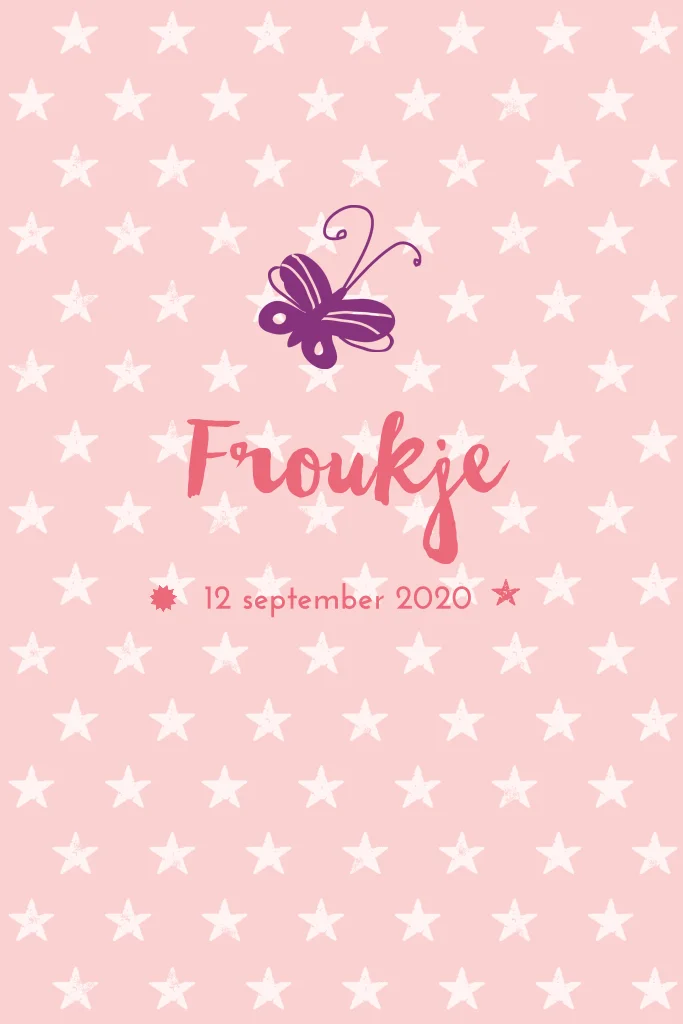 Mooie kinder-rouwkaart voor een meisje met vlindertje op een achtergrond van sterretjes.