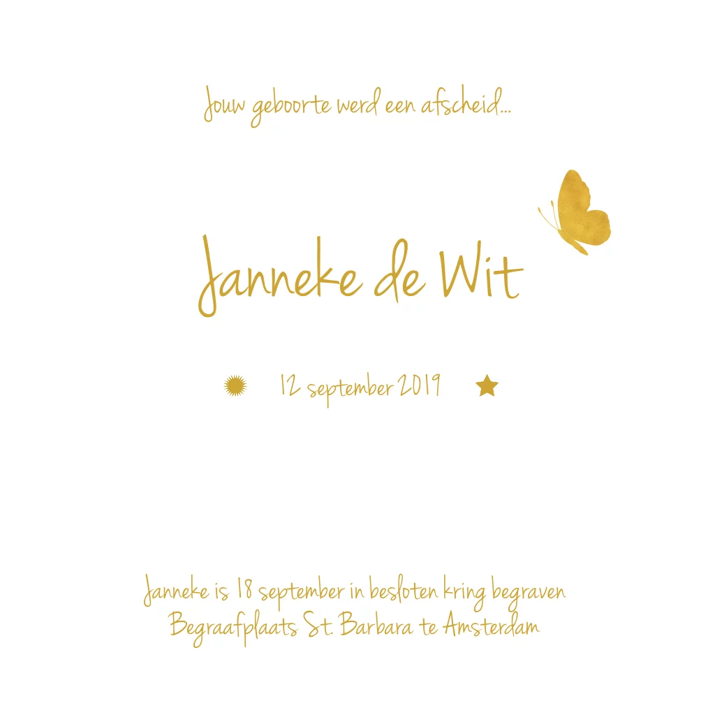 lief rouwkaartje voor baby en kind met goud-look vlindertje en sterren