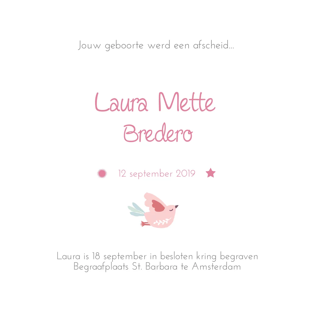 Mooie kinder-rouwkaart voor meisje met lief vogeltje op aquarel achtergrond. Stijlvolle rouwkaart voor vlinderkindje.