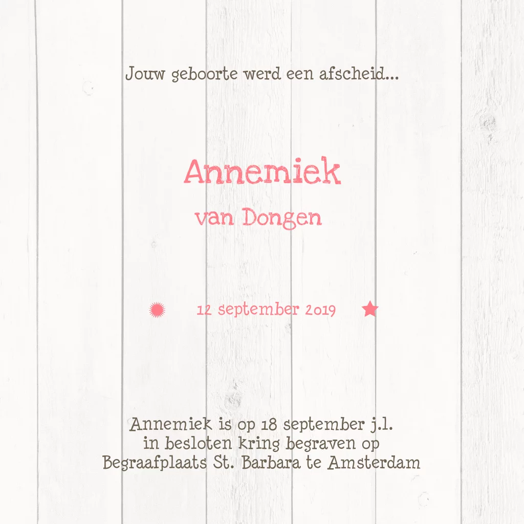 lief rouwkaartje voor kindje met stempel op sloophout