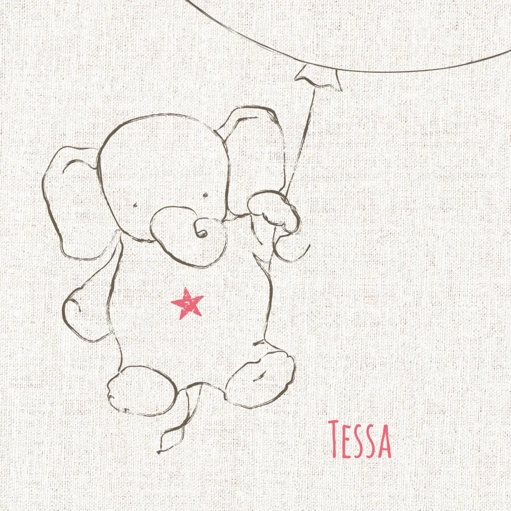 Mooie kinder-rouwkaart voor meisje, met getekend olifantje en ballon op linnen achtergrond.