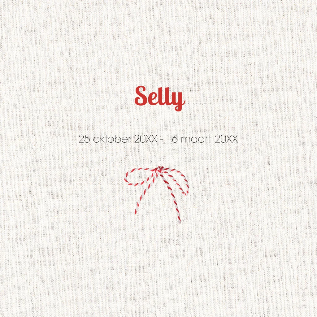 Mooie kinder-rouwkaart voor meisje, met rood-wit strikje op linnen achtergrond. Linnen rouwkaartje met stoffen roze strik.