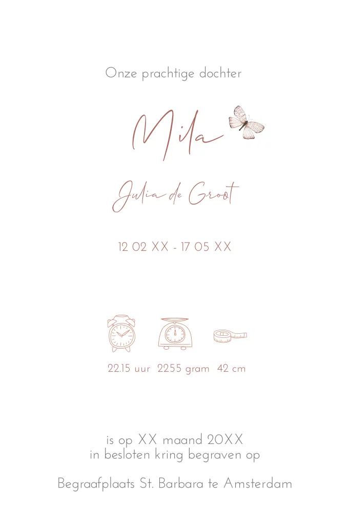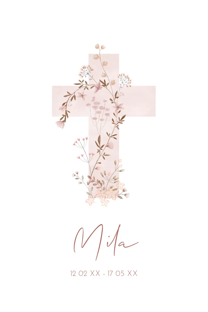 Lief baby rouwkaartje met waterverf kruis en kleine aquarel bloemetjes en takjes die er omheen kronkelen.