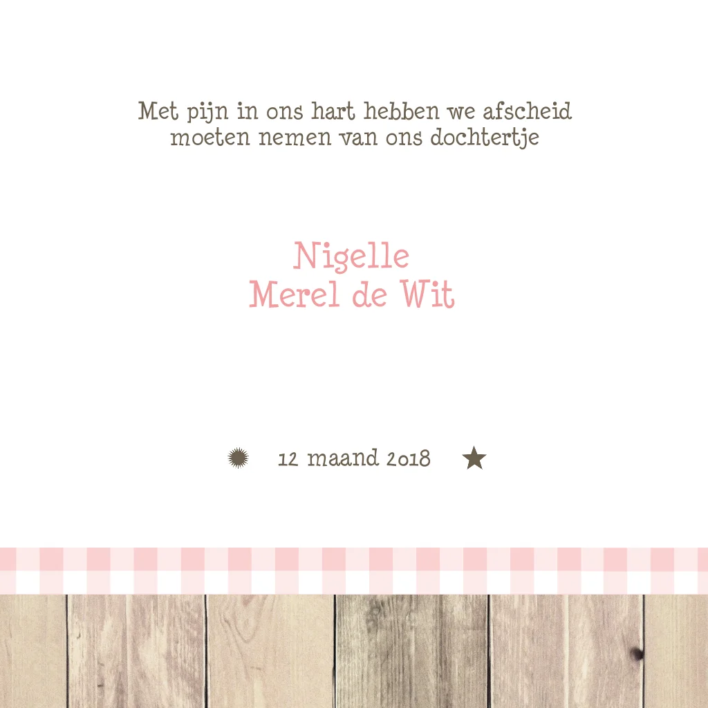 Mooie kinder-rouwkaart met steigerhout en gestempeld sterren-dessin waarop een houten ster met de naam van jullie kindje.