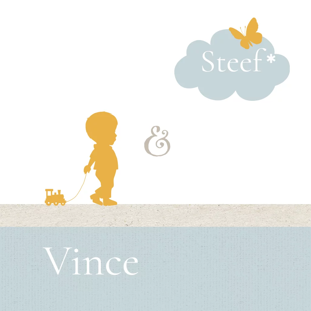Mooie kinder-rouwkaart voor tweeling waarvan één kindje is overleden, met silhouet van jongetje en vlindertje op kraftpapier. Tweelingkaart voor een vlinderkindje