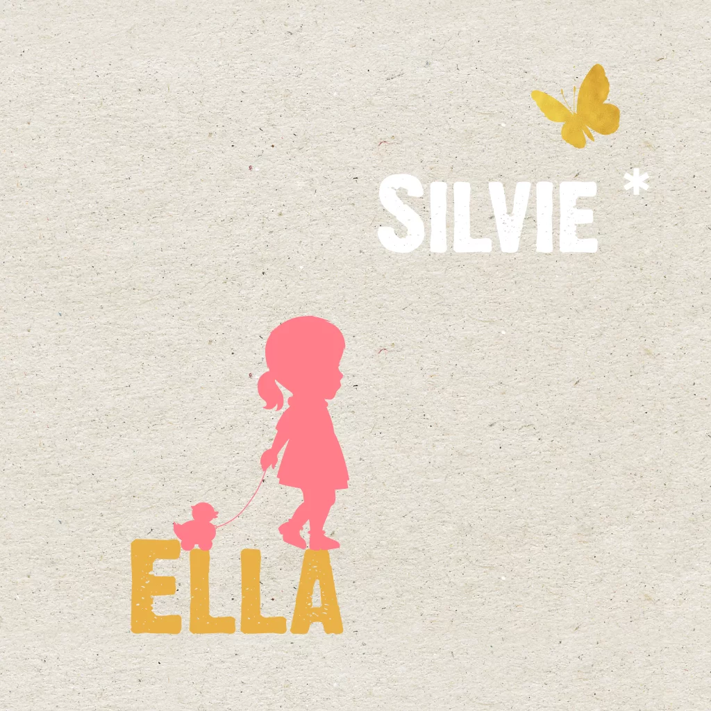 Mooie kinder-rouwkaart voor tweeling waarvan één kindje is overleden, met silhouet van jongetje en vlindertje op kraftpapier. Tweelingkaart voor vlinderkindje