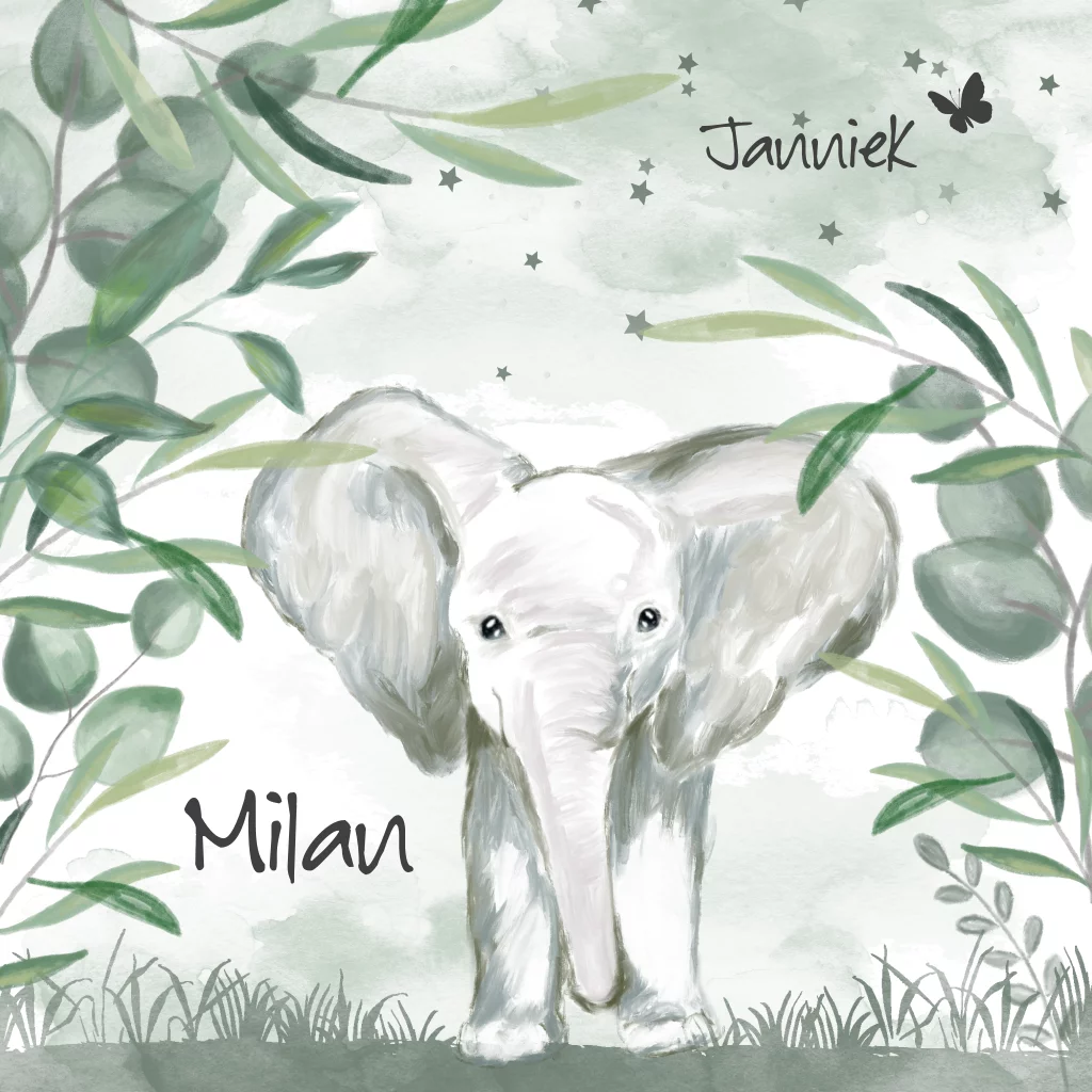 Mooie waterverf rouwkaart voor tweeling waarvan één kindje is overleden, met een olifantje van waterverf in de jungle. Tweelingkaart voor een vlinderkindje