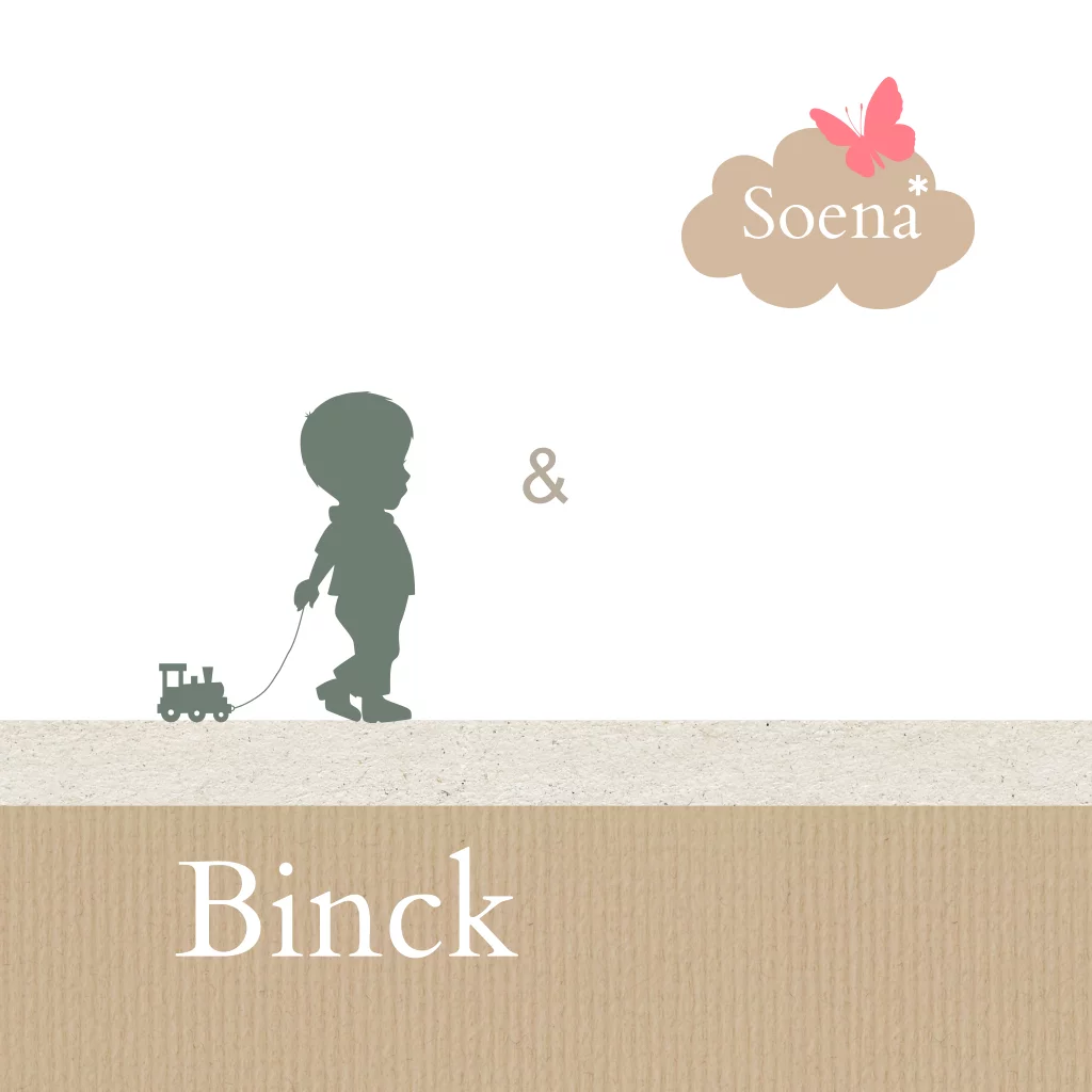 Mooie kinder-rouwkaart voor tweeling waarvan één kindje is overleden, met silhouet van jongetje en vlindertje op kraftpapier. Tweelingkaart voor vlinderkindje