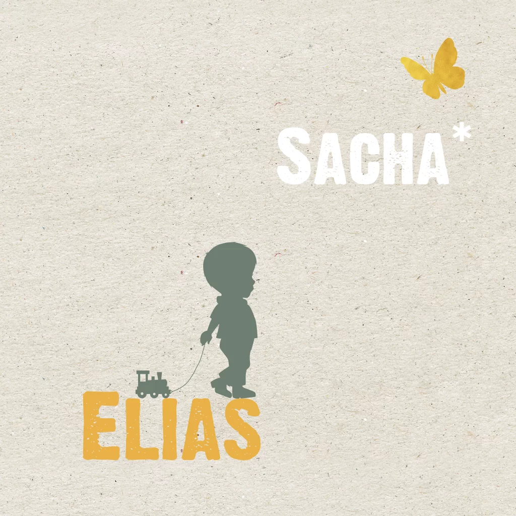 Mooie kinder-rouwkaart voor tweeling waarvan één kindje is overleden, met silhouet van jongetje en vlindertje op kraftpapier. Tweelingkaart voor vlinderkindje