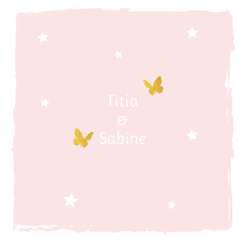 Mooie kinder-rouwkaart voor tweeling meisjes, met kleine sterretjes en gouden vlindertjes. Lief babyrouwkaartje voor vlinderkindjes met sterren om zelf te maken.