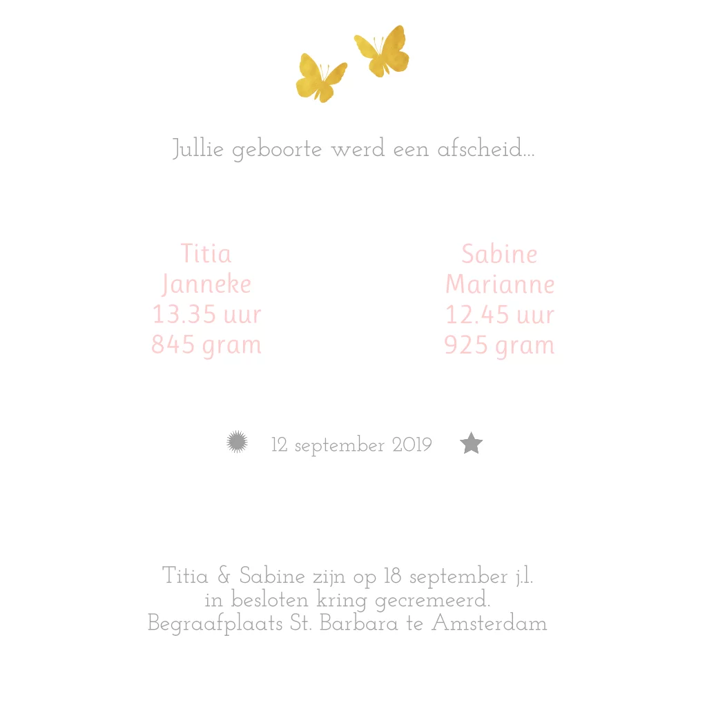 Mooi rouwkaartje voor tweeling met sterren en gouden vlindertjes
